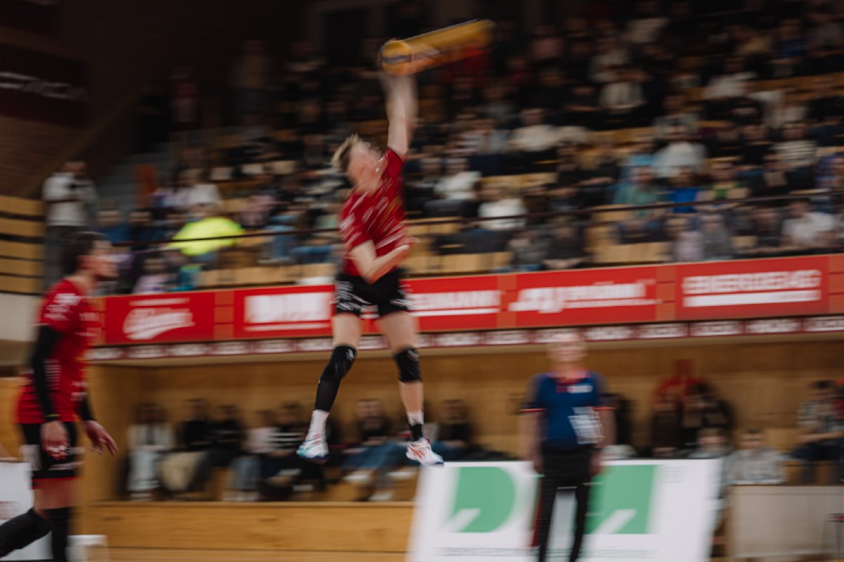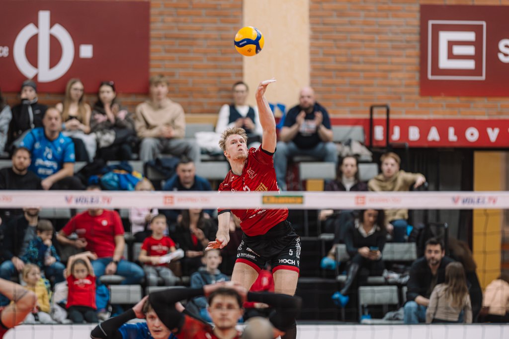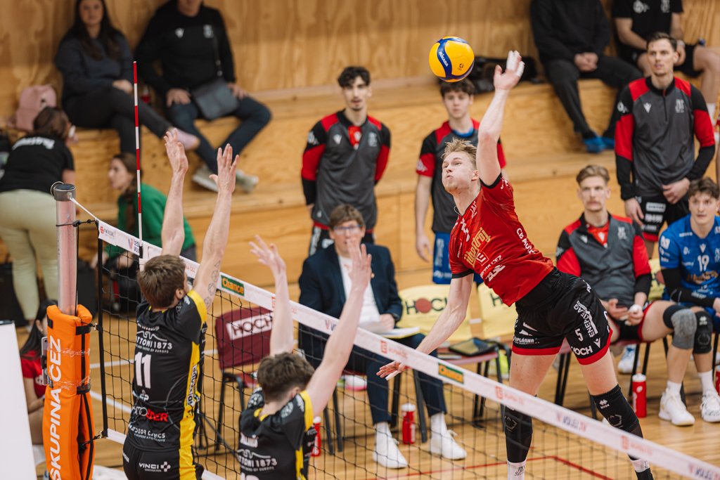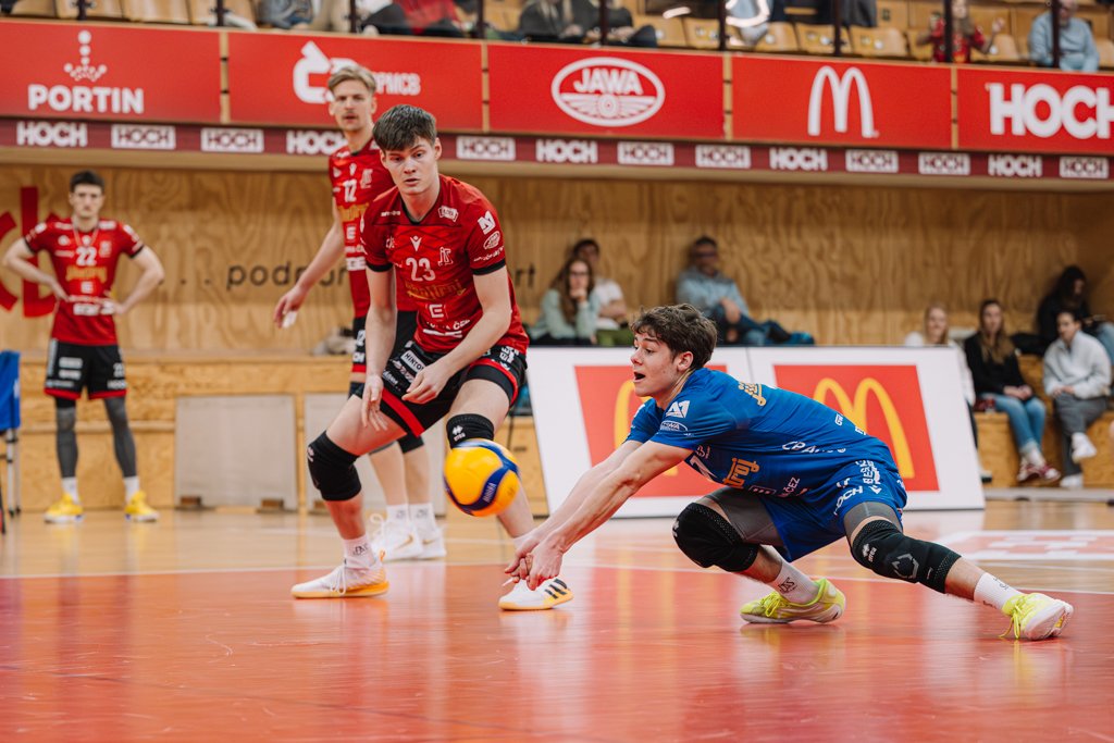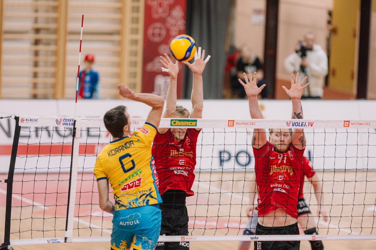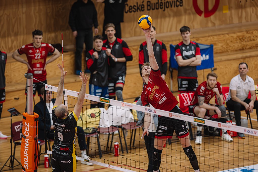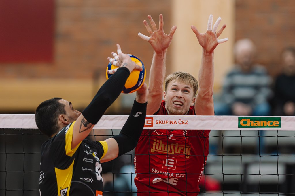 Hostující nahrávač Zdeněk Haník připravuje smeč Tomáši Širokému -